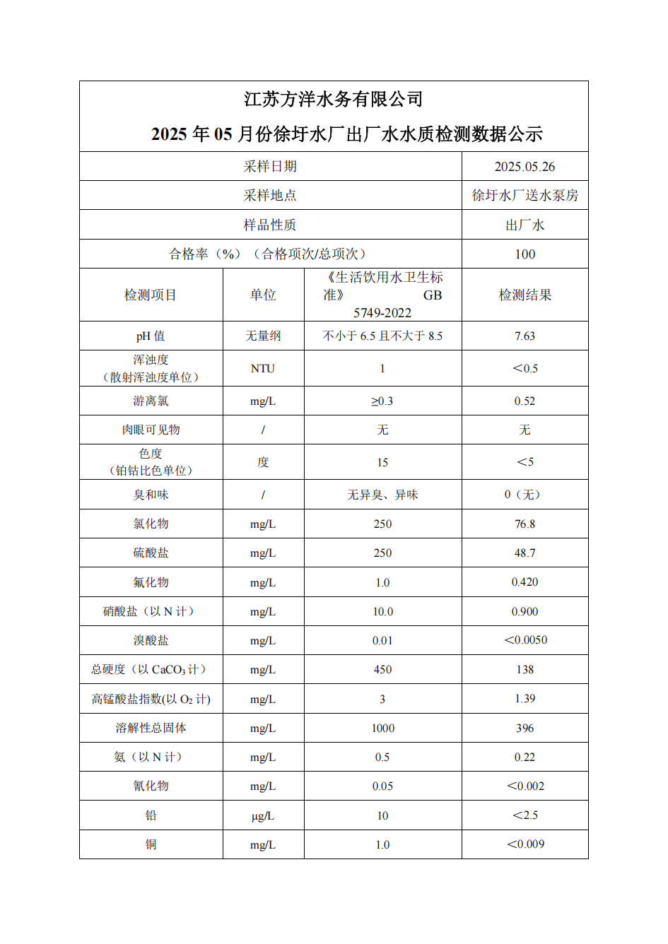 2025年5月徐圩水厂出厂水月检公示数据