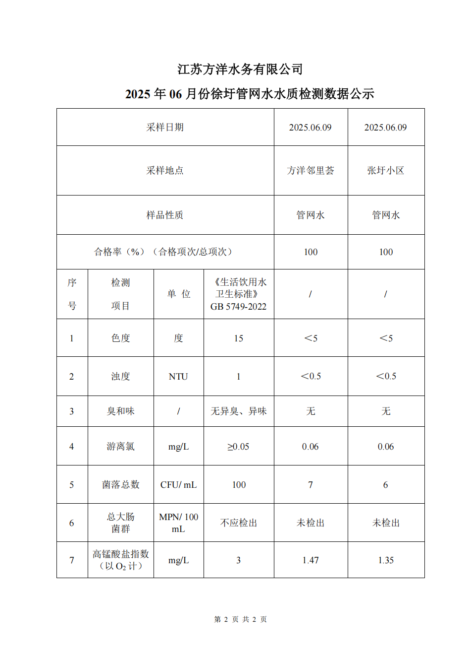 2025年6月份管网水上半月检水质检测数据公示表