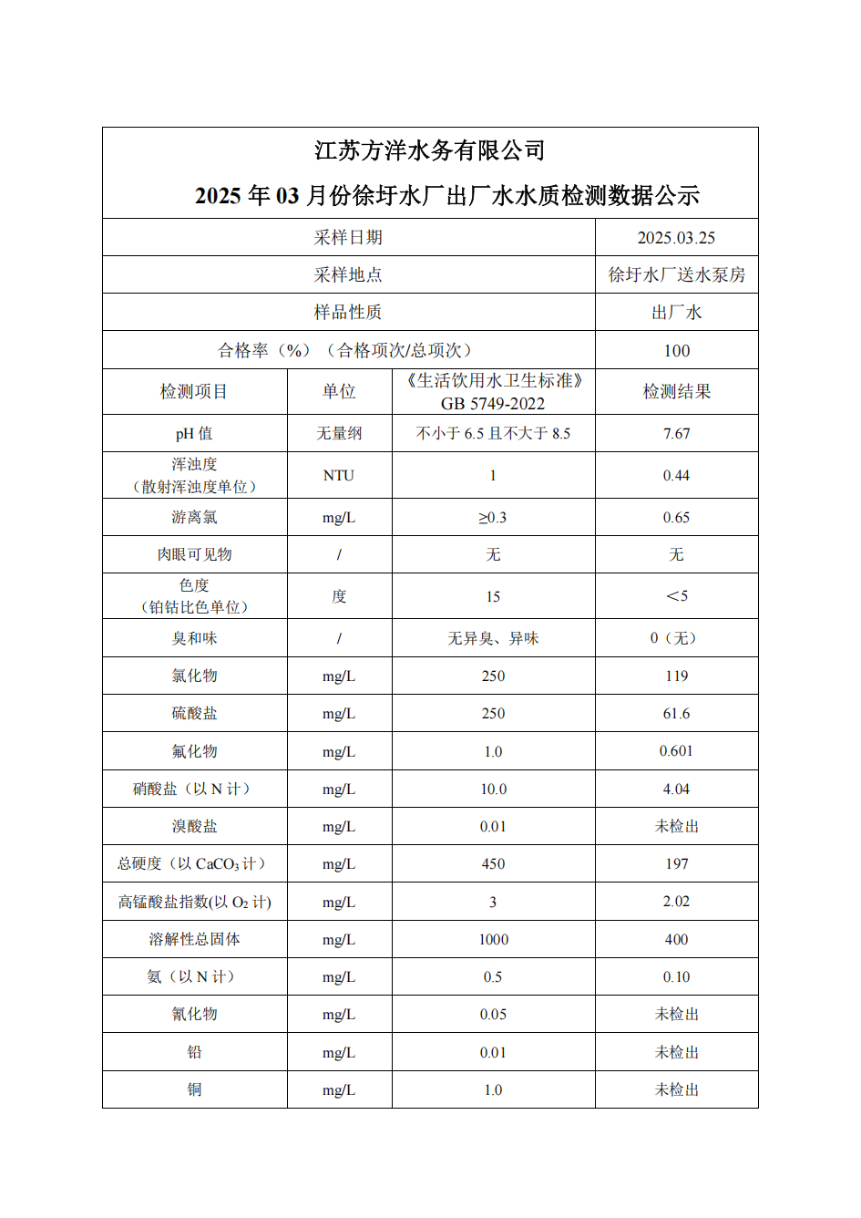 2025年3月徐圩水厂出厂水月检公示数据