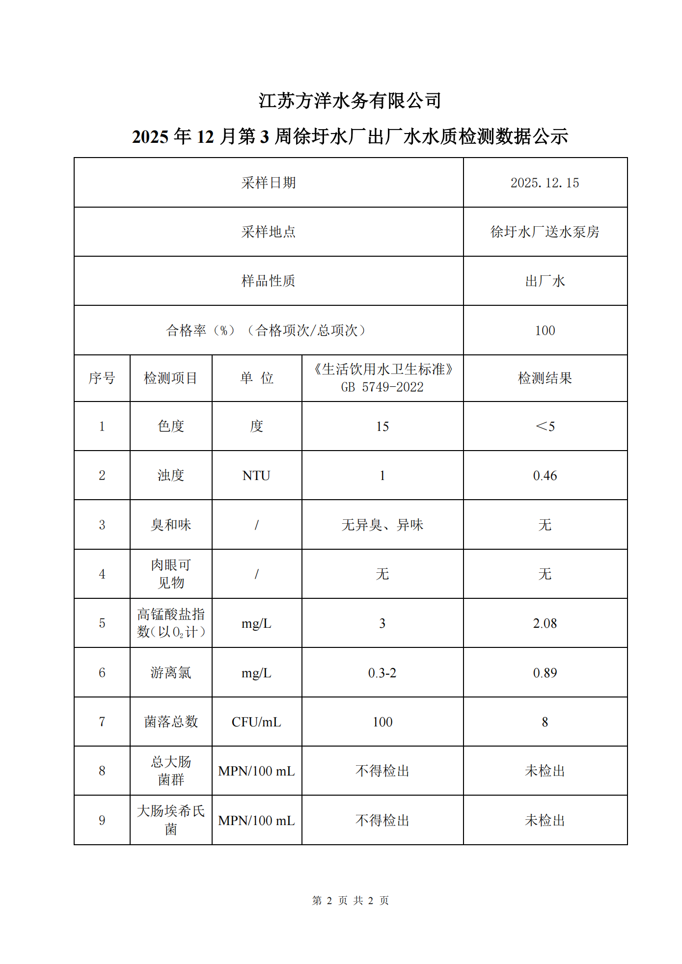 2025年12月第3周出厂水日检水质检测数据公示表