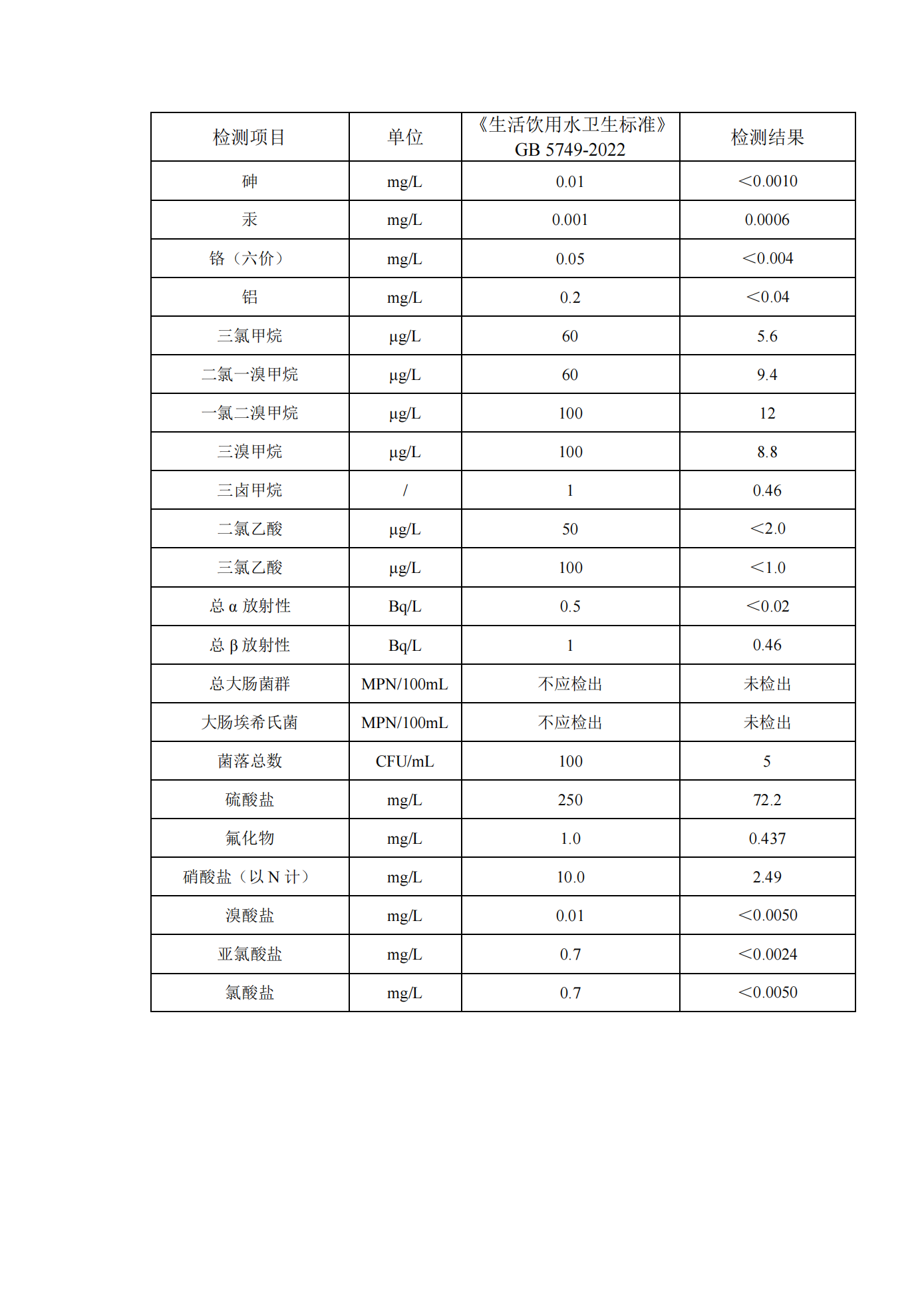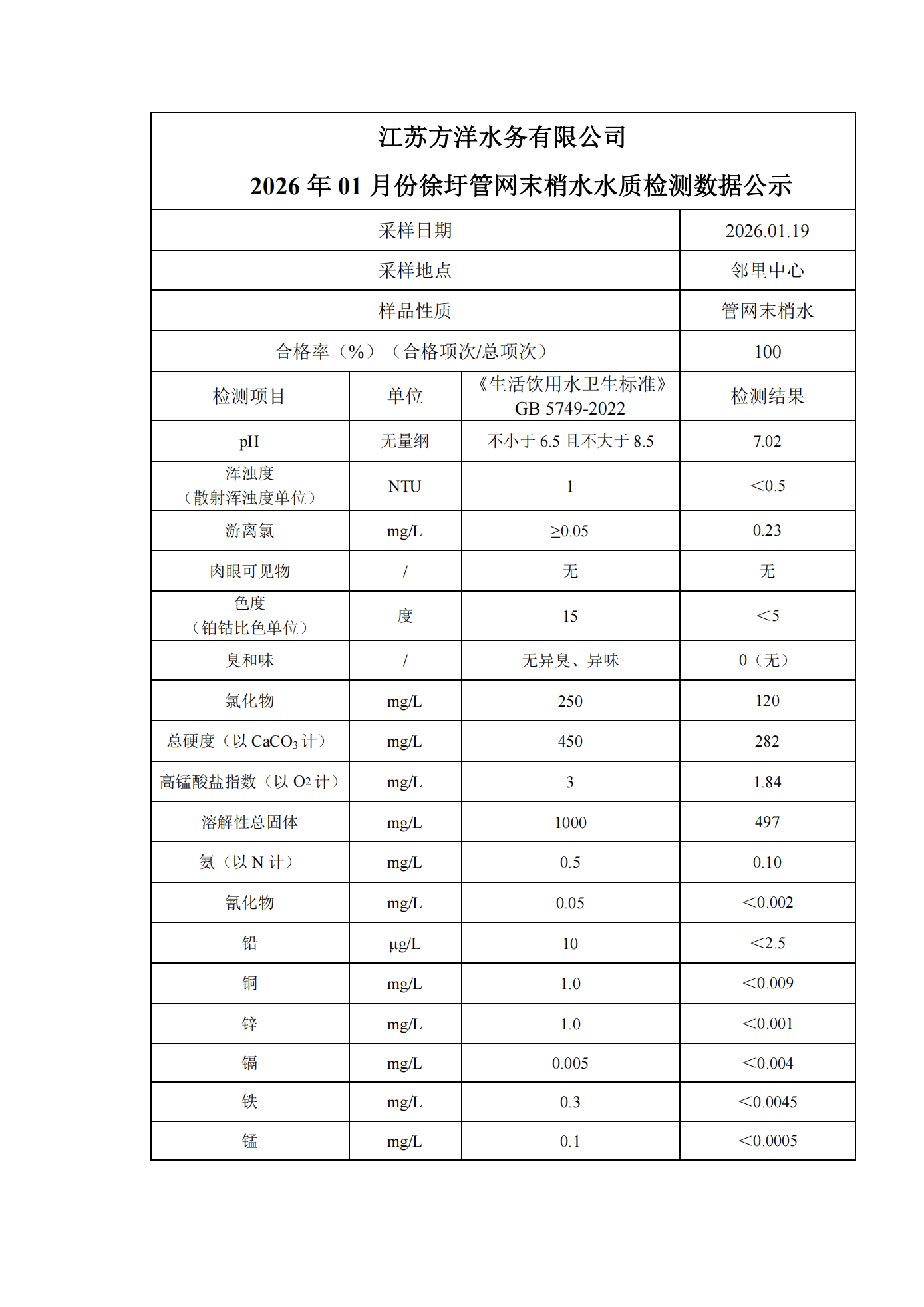 2026年1月份管网水月检水质检测数据公示表