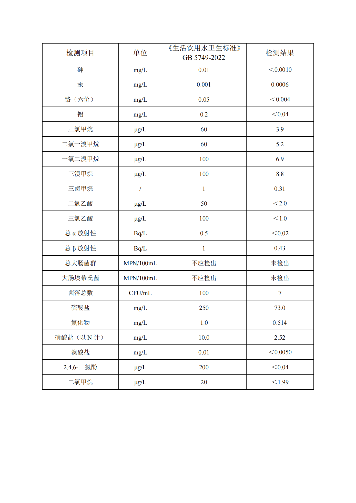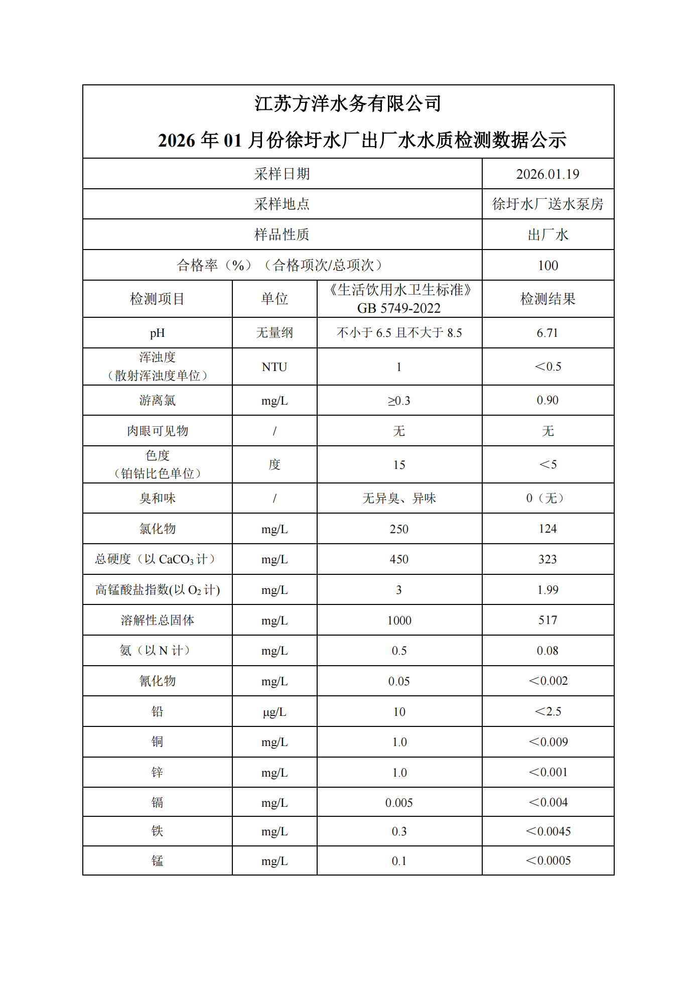 2026年1月徐圩水厂出厂水月检公示数据